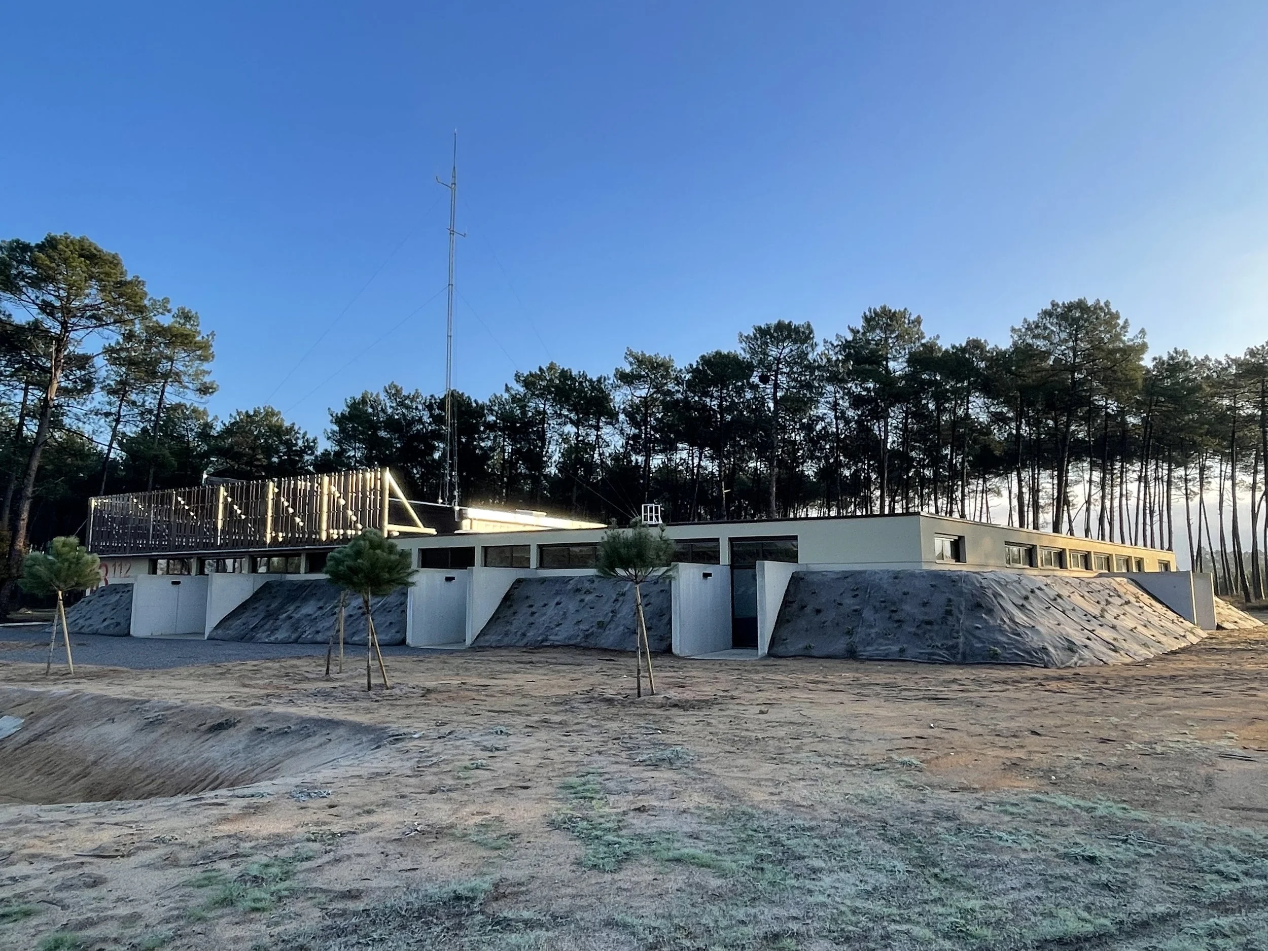 Une attention particulière est portée sur une intégration paysagère où le bâti s’élève au niveau de 3 strates : le sol – l’horizon – la forêt. De plus il est pensé une architecture vertueuse et étudié toutes les possibilités de diminuer l’impact carbone. Le projet du CIS prend alors forme et sa morphologie s’harmonise avec le site, le lieu, le terrain : des talus (sol) bordent et entourent les façades les plus exposées aux bruits, contacts permettant le réemploi des terres excavées et une meilleure inertie ; des fenêtres hautes (horizon) protègent des liens visuels directs vers l’intérieur et libèrent la surface des murs intérieurs ; des brise- soleils (forêt) se déploient vers le ciel pour camoufler la toiture de la remise et rythment la façade à l’image des troncs des forêts de pins. Enfin, la zone « bureaux » se développe autour d’un patio vitré pour un apport calorifique pendant les périodes hivernales.